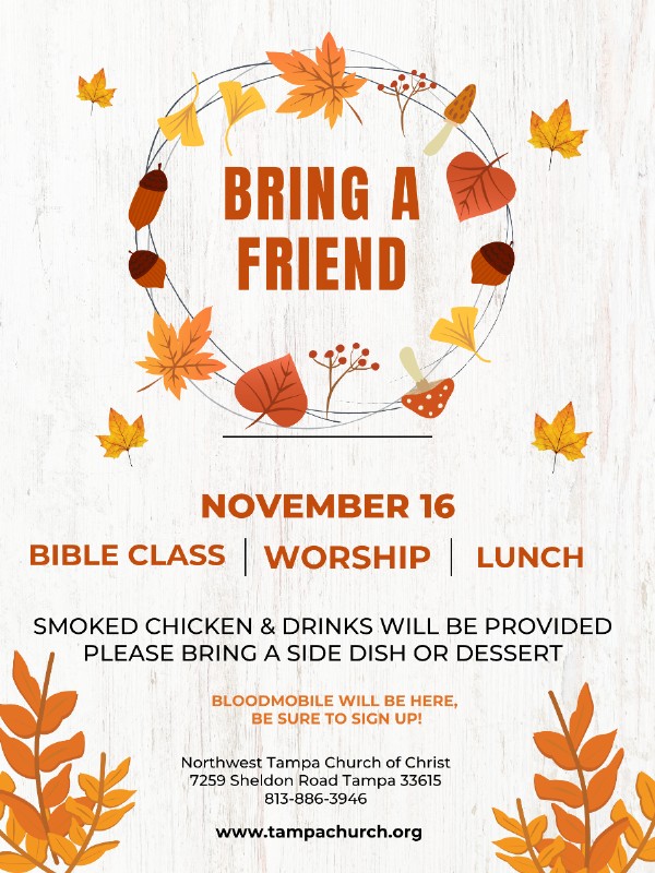 Join us for class, worship and fellowship on Sunday, November 16. Bible class at 9:30am for all ages followed by worship service at 10:30am. After services, we will enjoy a special meal together. Smoked chicken will be provided. Please bring a side dish or dessert to share. Invite a friend!